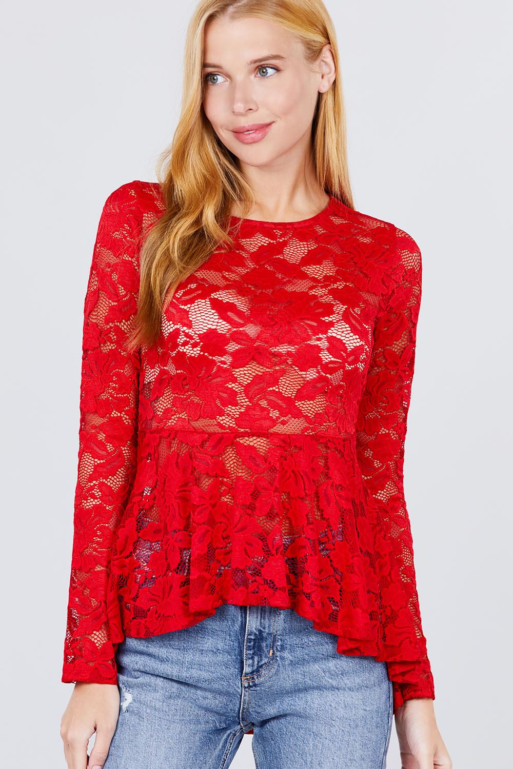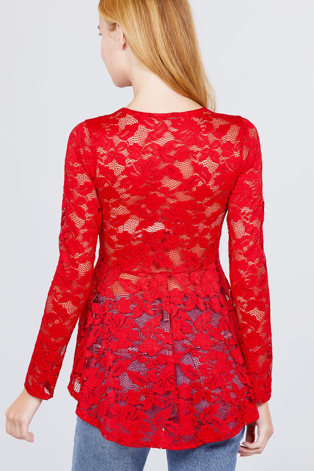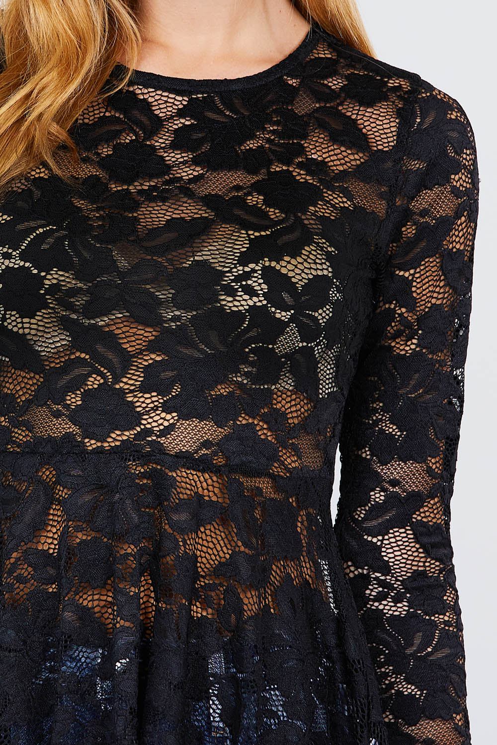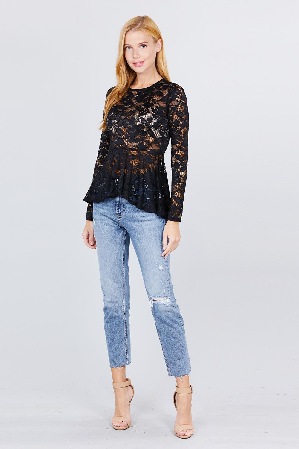 HAUT EN DENTELLE PEPLUM À MANCHES LONGUES ET COL ROND