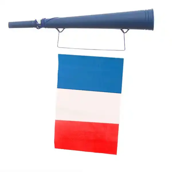 Appuyez l’équipe de France dans les stades avec le klaxon de stade drapeau français ! Fabriqué en plastique. Environ. dimension : 5 x 36 cm.