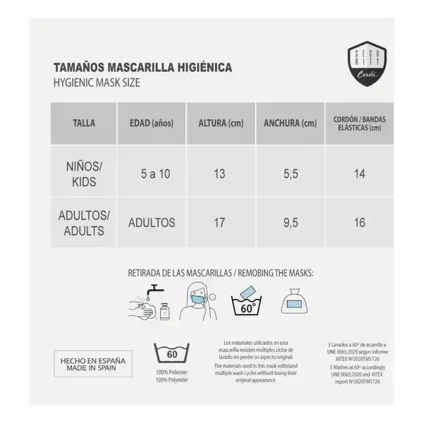 - 5 lavages à 60 °C selon UNE 0065:2020